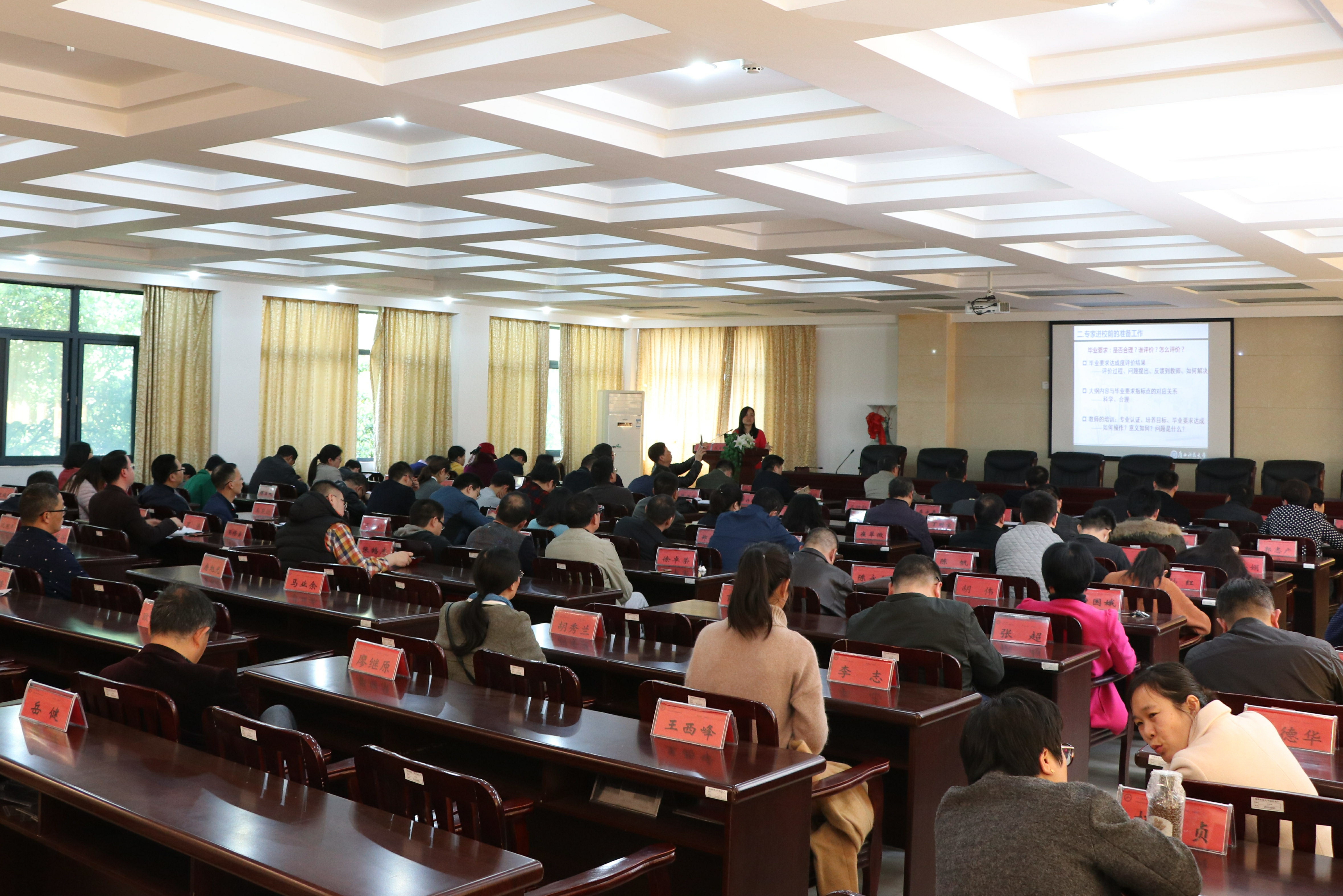 讲座伊始,祝院长向在座人员隆重介绍了邓朗妮教授。随后,邓教授就“土木工程专业认证专家进校考察前的准备工作”进行了精彩的讲座。首先,邓教授讲解了如何正确理解工程认证的内涵——“学生中心是宗旨,成果导向是要求,持续改进是机制”,并结合广西科技大学开展的具体工作对专家组进校进行了深入地解释。随后,她就广西科技大学顺利通过土木工程专业认证的经验,详细地介绍了专家组进校前的准备工作和注意事项。最后,她并以实例的形式对专家组进校考察的具体工作流程做了详实介绍。