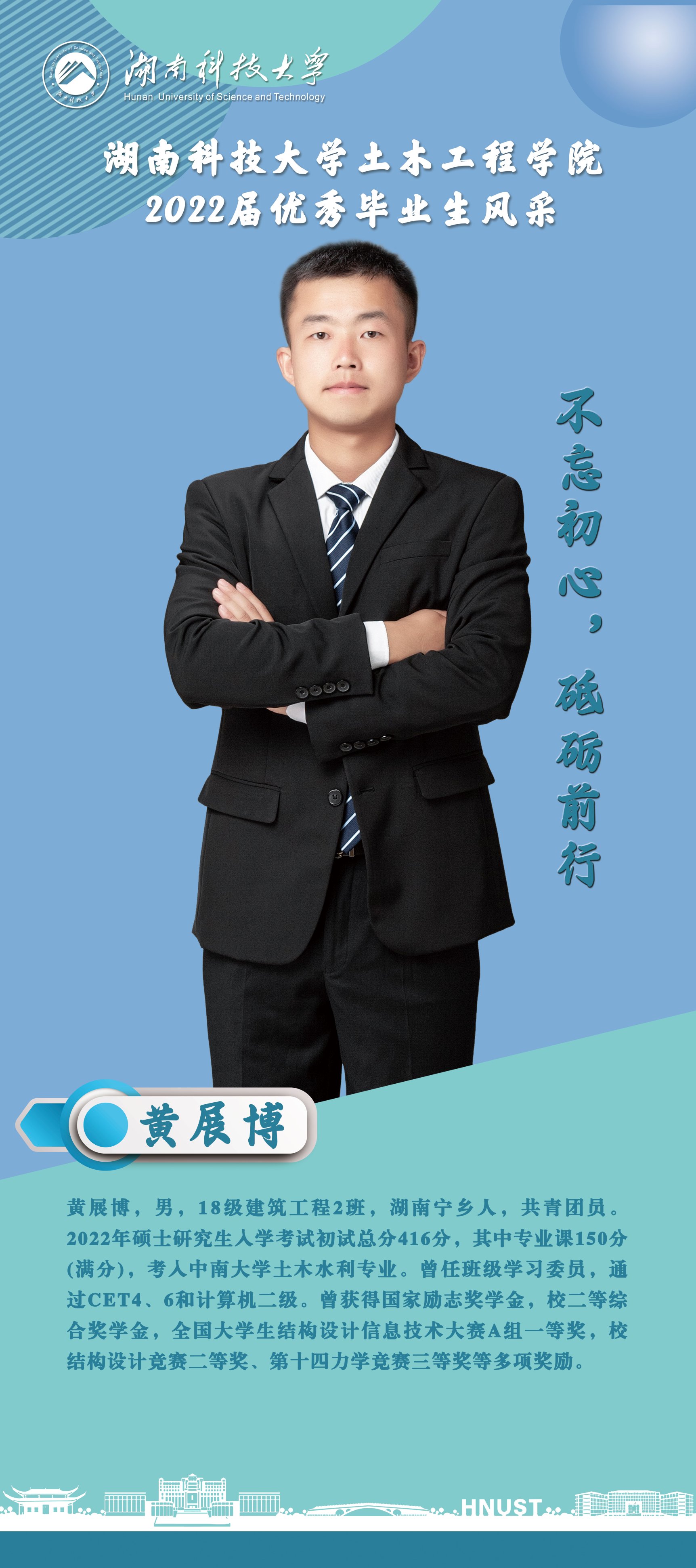 黄展博,男,18级建筑工程2班,湖南宁乡人,共青团员。曾任班级学习委员,在校期间获得“国家励志奖学金”,“二等综合奖学金”,“全国大学生结构设计信息技术大赛A组一等奖”,“tapplay第八届结构设计竞赛二等奖”,“结构建模协会第三届设计竞赛三等奖”,“tapplay第十四力学竞赛三等奖”等多项奖励,并顺利通过CET4、CET6、全国计算机二级考试。2022年硕士研究生入学考试初试总分416分,其中专业课150分(满分),考入中南大学土木水利专业。