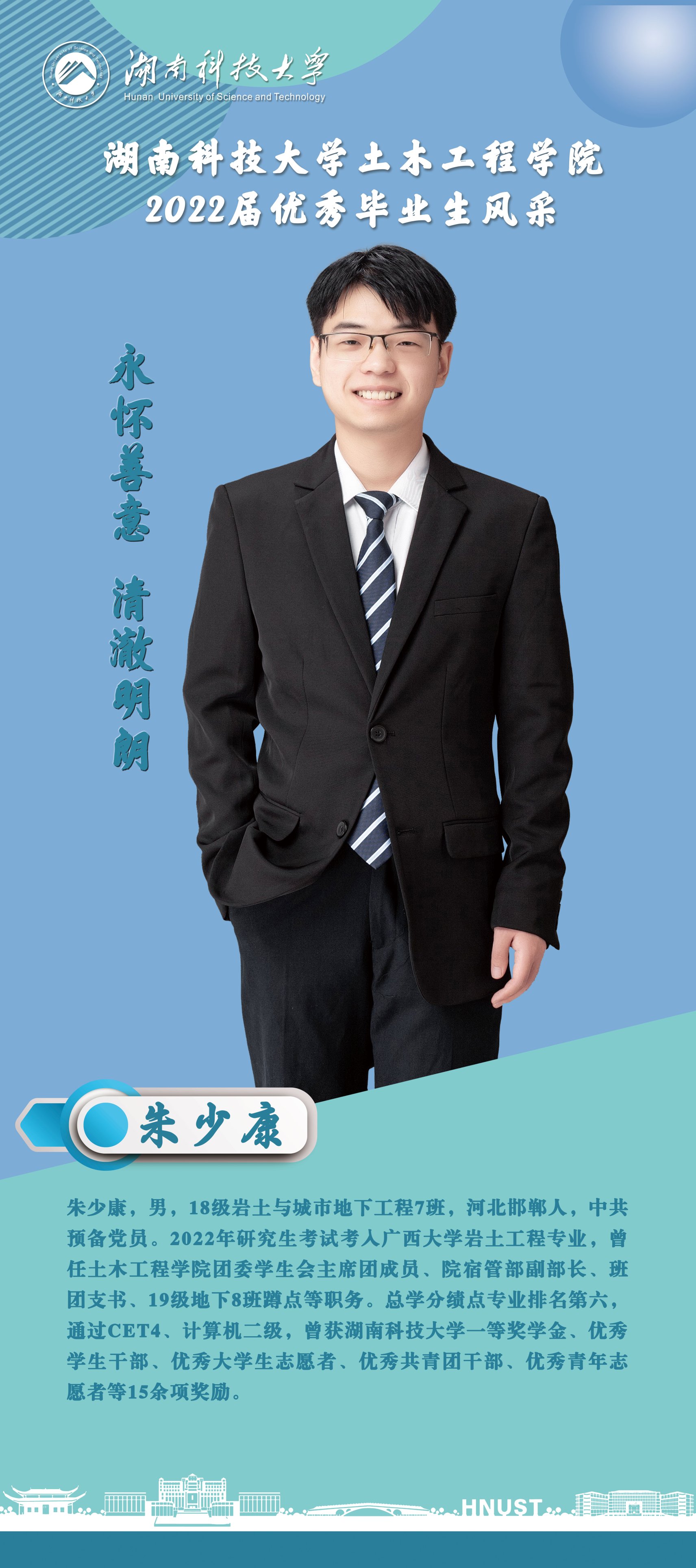 朱少康,男,18级岩土与城市地下工程7班,河北邯郸人,中共预备党员。在过去的大学四年中,我曾担任tapplay团委学生会主席团成员、院宿管部副部长、班级团支书、19级地下8班蹲点、科技委员。大学以来,总学分绩点专业排名第六,曾获tapplay一等奖学金、三等奖学金、优秀学生干部、优秀大学生志愿者、优秀共青团干部、优秀青年志愿者、特殊贡献奖、文体活动先进个人等15余项奖励,通过了国家英语四级、计算机二级。在学校和学院的精心栽培、老师们孜孜不倦的教导下,我在大学里不断成长着、稚嫩的面庞更加成熟、浮躁的心灵得到充实。