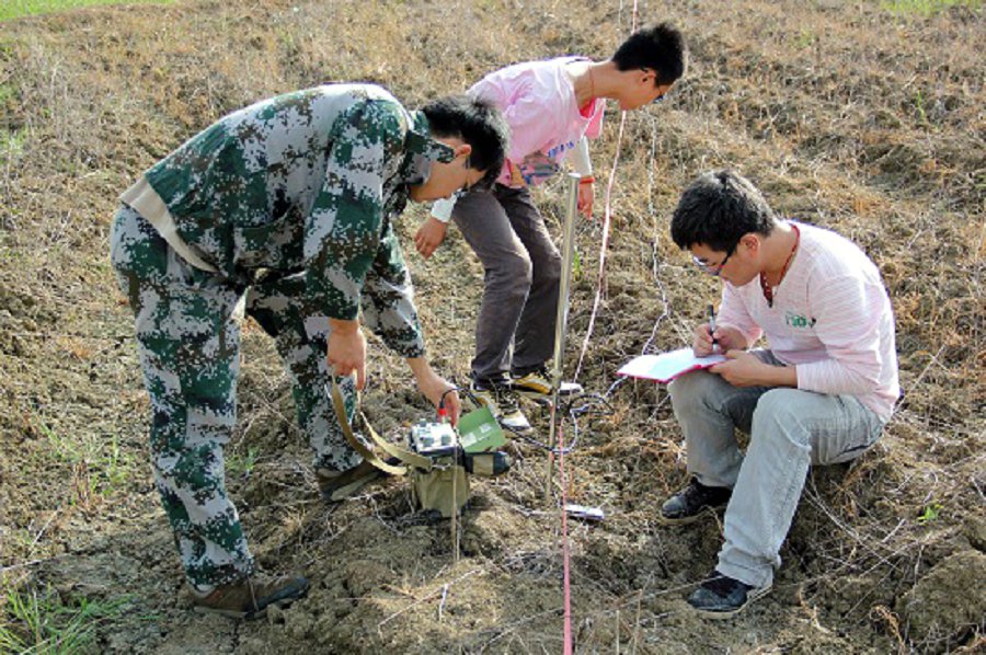 湖南省永州市新田县火里塘村是湖南省国土资源厅建设重点扶贫点,该村常年严重缺水,生活用水和农业用水常年得不到保障。找水小分队通过与村官、村民的交流,对当地的情况有了初步了解,然后把附近一片废弃的农田作为第一个测试点,接着他们陆续地把天然电场选频仪、电极、电线、皮尺等测量工具带到试验田。首先队长用皮尺圈定测量范围,其他队员各自负责自己的事情,有条不紊,不到半个小时,基本工作都已经完成。最重要的是数据采集环节,在烈日下,找水小分队面朝黄土背朝天,在每个测试点都认认真真的读数和记录数据,为了避免出现错误,小分队成员都会重复做一次试验,有时因为数据的波动性较大,会重复做更多次。在两个测试点之间,小分队队员们不厌其烦地重复同样的动作,汗水渐渐地浸透了他们的衣裳。通过他们的不懈努力,百分之八十的工作在中午之前已经完成。吃过午饭,休息一段时间后,小分队4点半再次出发前往火里塘村完成剩下百分之二十的工作。