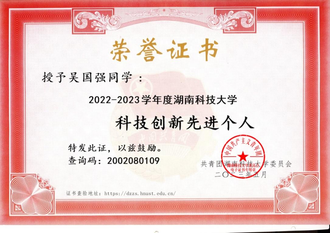 大学期间,班级累计获得国家级奖项 11 项,省级奖项 23 项,校级奖项 176 项,同时还在学术科研方面取得突出成绩,累计科研立项校级及以上共 7 项,申请专利 12 项,发表学术论文 2 篇。其中,万功兴同学获得tapplay 2023 年度“十佳大学生”,吴国强同学作为项目负责人获得第十八届“挑战杯”全国大学生课外学术科技作品竞赛二等奖,刷新了学校十多年来在该赛事上的最好成绩。