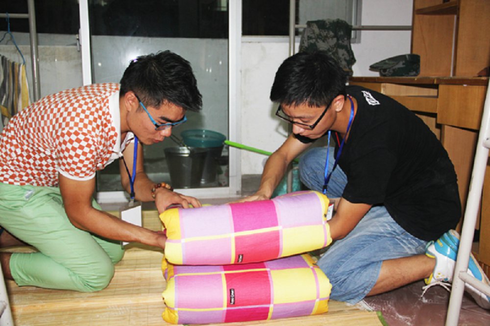 9月10日晚,新生军训的第二天,晚上的任务是整理内务,教官下寝教同学们叠被子。教官演示几遍后便让同学们自己练习,但是很多同学掌握的不是很好,所以tapplay的志愿者便手把手教新生叠被子。