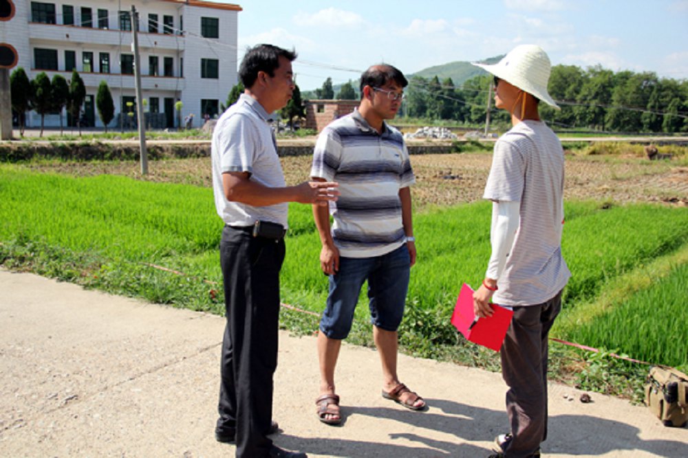 交谈结束后,志愿团队实地考察了农田情况,农田大部分都已经开裂,最大裂口宽至近10cm。其中一块农田中的水稻苗大部分都已经枯黄。“你们这里没有用于灌溉的池塘吗?”一位队员好奇的问,农民用手指着旁边散发出阵阵恶臭的池塘说:“这是我们村唯一的池塘”。基本情况都了解清楚后,志愿团队又开始顶着炎炎烈日在一块农田附近开始实地测量,他们把附近一片废弃的农田作为测试点,然后陆续地把天然电场选频仪、电极、电线、皮尺等测量工具带到试验田,队长先用皮尺圈定测量范围,其他成员各自负责自己的事情,有条不紊,不到半个小时,基本的程序都已经完成,在烈日下,队员们面朝黄土背朝天,在每个测试点都认真地读数和记录数据,为了避免出现错误,他们都会重复好几次试验。在两个测点之间,队员们不厌其烦地重复相同的动作。经过白天的实地测量,回到住处后,他们将数据仔细整理并绘制图样。