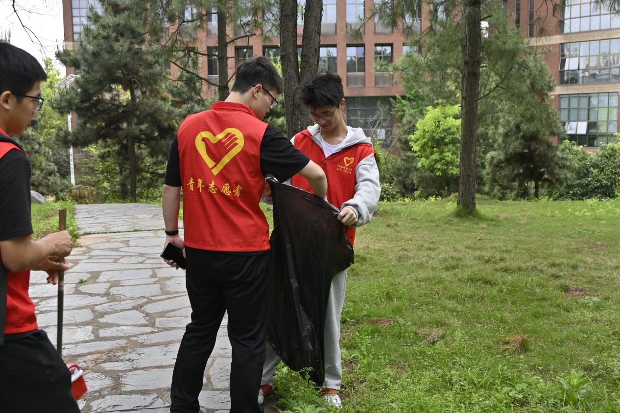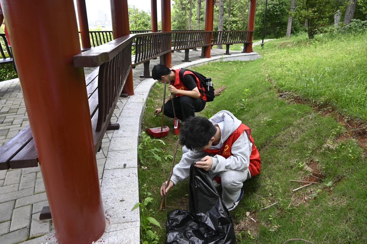 图为志愿者收集着清洁来的垃圾,将其全部带走让松园一尘不染。