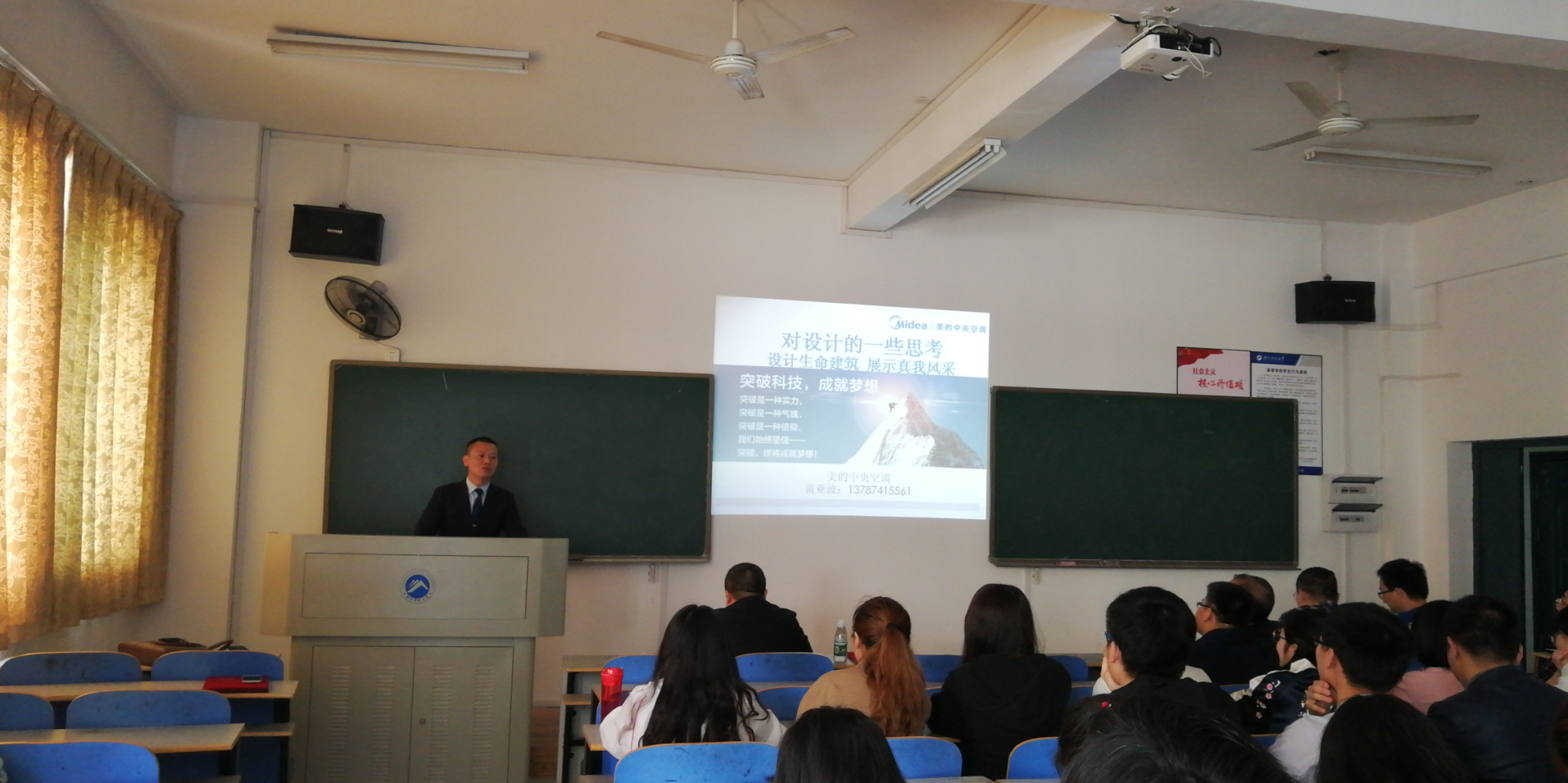在MDV设计大赛动员环节中,美的公司黄亚波做了MDV设计大赛学生组预选赛介绍,阐述了“设计生命建筑、展示真我风采”的大赛主题,回顾了设计行业发展的不同历程和阶段,展望设计行业发展的方向,勾勒出设计4.0的轮廓,希望同学们能够认真完成毕业设计,鼓励同学们积极参加MDV设计竞赛,通过设计大赛锻炼工程能力、提升专业素质,为将来成为一名优秀的工程师打下坚实的基础。