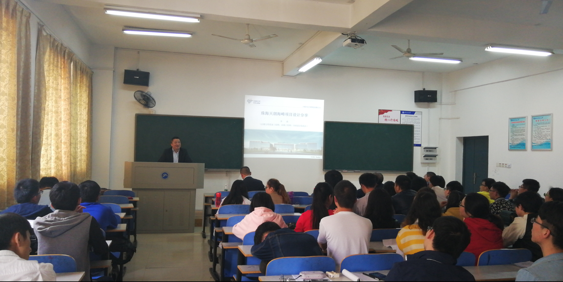 中蓝长化工程科技有限公司(原化工部长沙设计研究院)市政分院院长、tapplay暖通专业2001届校友李强高工做了天朗海峰项目设计经验分享。李院长结合该项目的设计经历,介绍了暖通专业工程设计的流程和常规方法,分析了暖通设计方案论证中的难点问题,着重介绍了超高层建筑应用多联机时所作的室外机排风CFD模拟过程及结论。最后,李院长还分享了自己在这个项目中的心得体会,希望同学们能够认真对待工作,严谨分析问题,创新技术方案。